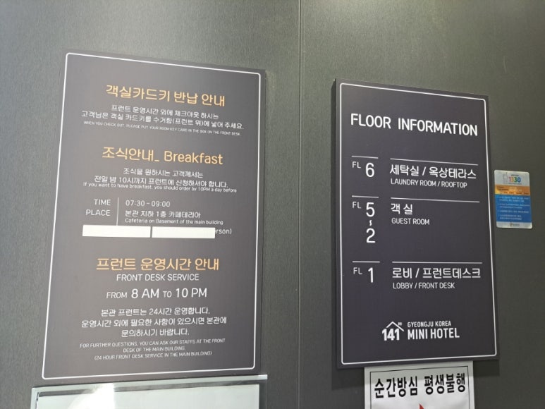 There was information posted about breakfast service, but we didn’t end up trying it. From what we were told, guests can sign up at the front desk by 10:00 p.m. the night before, and breakfast costs KRW 3,000.