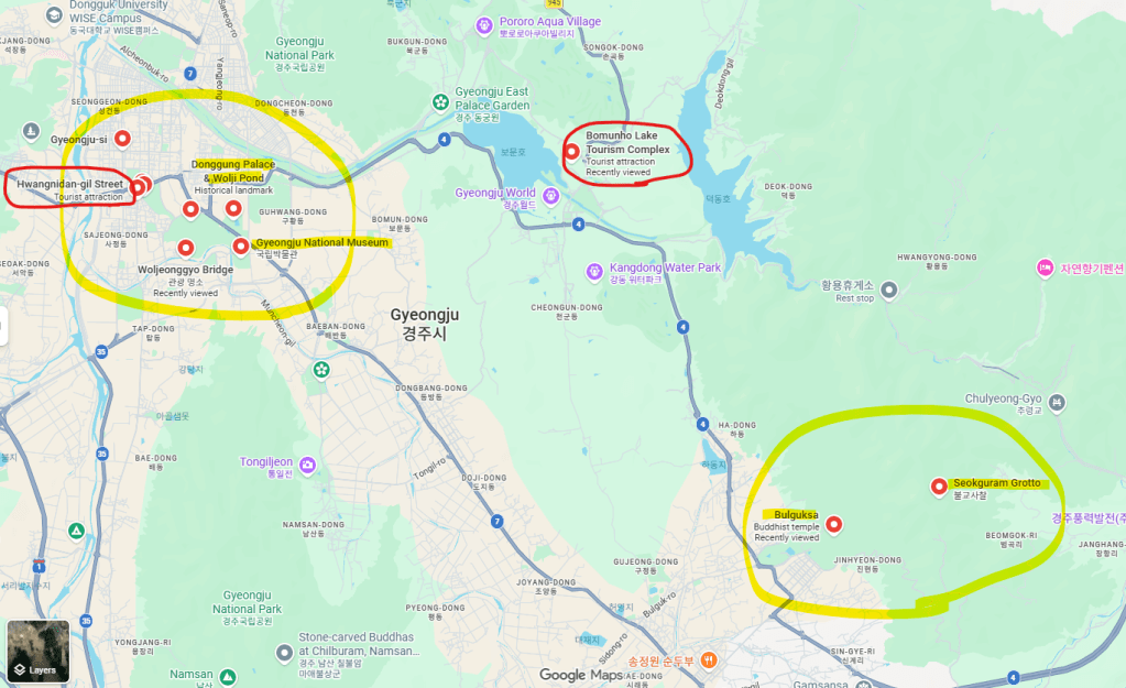 The yellow area in the lower right of the map shows where Bulguksa Temple and Seokguram Grotto are located. As these sites are a bit farther from the city centre, it is recommended to visit them together as a half-day or full-day trip.